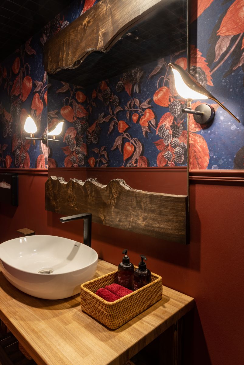 Красивый санузел - это показатель уровня сервиса и общей атмосферы заведения. Именно такой подход выбрала дизайнер Екатерина Ефремова, преобразив пространство ресторана «Винный Грот» в Самаре. Благодаря бесшовным обоям ECO с изображением (Арт. 35149) физалисов из дизайнерской коллекции «Enjoy» от ОРТОГРАФ, санузел заиграл новыми красками.